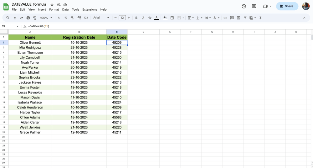 3. For example, if you type =DATEVALUE(B2), which consists of “10-10-2023”, you will get 45209, which represents the serial number of the cell B2.