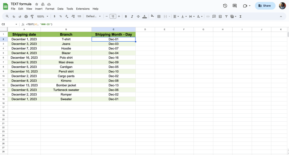 2. =TEXT(A2, "MMM-DD") for a cell that contains “December 1, 2023”; it will give you only the day, which is Dec-01.