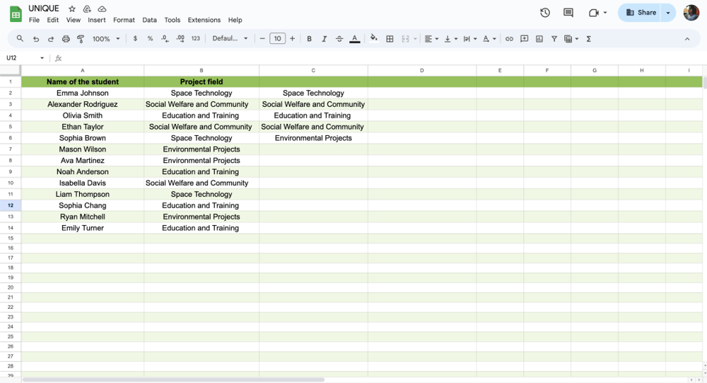 In diesem Schritt ist es Zeit, aktiv zu werden. Um die Anzahl der eindeutigen Werte zu finden, müssen Sie =UNIQUE(Zellbereich: Zellbereich) eingeben und Eingabe drücken. Zum Beispiel müssen Sie in dem unten gegebenen Szenario =UNIQUE(B2:B14) eingeben. Drücken Sie dann die Eingabetaste und sehen Sie die eindeutigen Daten in einer einzigen Spalte.