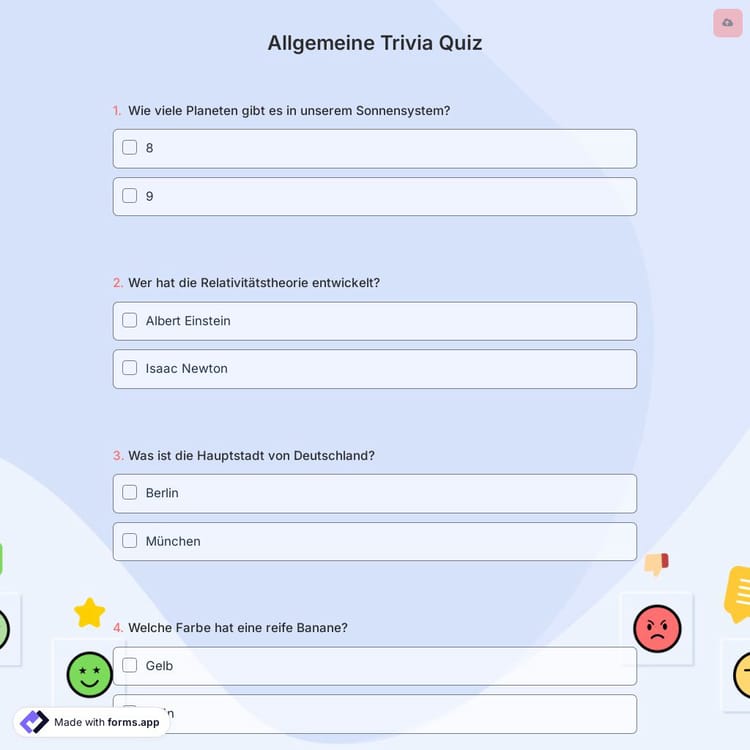 Allgemeines Quiz ist eine Art Online-Quiz , das allgemeine Kulturthemen wie Geschichte, Kunst, Sport, Geographie, Mathematik und Sprache abdeckt. Allgemeine Quizfragen sind eine der am häufigsten verwendeten Quizarten, sowohl zum Spaß als auch zum Lernen. Es kann die Aufmerksamkeit von Studierenden erregen, insbesondere wenn es im Bildungsbereich eingesetzt wird. Mit der allgemeinen Trivia-Vorlage, die Ihnen forms.app bietet, können Sie in schnellen Schritten mit der Erstellung Ihres Quiz beginnen. Viele Bearbeitungs- und Anpassungsoptionen von forms.app helfen Ihnen dabei, genau die Art von Quiz zu erstellen, die Sie möchten.