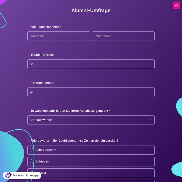 Alumni-Umfragen liefern wertvolles Feedback, das die Institution nutzen kann, um die Qualität ihrer Bildungsprogramme zu verbessern. Dies gibt Ihnen neue Ideen, die Sie zur Innovation und Wettbewerbsfähigkeit nutzen können. Verbessern Sie Ihre Bildungsprogramme und Dienstleistungen mit dem kostenlosen Alumni-Umfrage-Modell von forms.app. Denken Sie daran, dass Modelle und alle intelligenten Funktionen kostenlos sind!