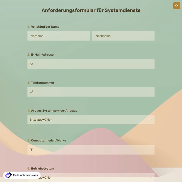 Für Wartungs- oder Support-Anforderungen von Geräten können Systemwartungsauftragsformulare sehr hilfreich sein und Ihre Arbeit erheblich erleichtern. Aus Sicht Ihrer Kunden wird dies sehr praktisch und nützlich sein. Sie können auch sofortige Benachrichtigungen erhalten und Maßnahmen ergreifen, wenn Ihre Kunden das Formular ausfüllen.Die kostenlosen Formularvorlagen von forms.app sind komplett kostenlos und Sie können das Formular anpassen, um Sie oder Ihr Unternehmen zu repräsentieren. Verwenden Sie erweiterte Funktionen, Integrationen, verschiedene Fragetypen und vieles mehr. Beginnen Sie noch heute mit forms.app und vereinfachen Sie Ihren Workflow!