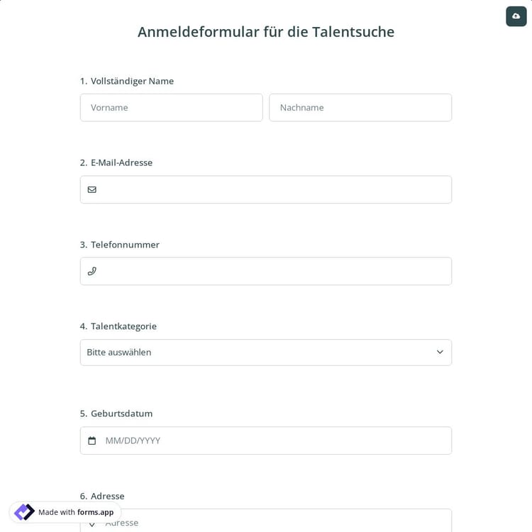Suchen Sie nach Fachleuten in bestimmten Bereichen und einer einfachen Möglichkeit, sie zu kontaktieren? Mit der intuitiven Vorlage für Talent-Suche Anmeldeformulare von forms.app können Sie in wenigen Minuten Ihr eigenes Talent-Suche Anmeldeformular erstellen!