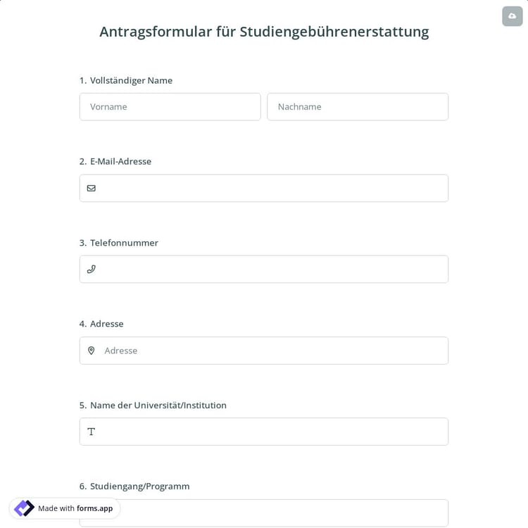 Wenn Sie die Rückerstattungsanträge für Schulgebühren, die Ihre Kunden für sich selbst oder ihre Kinder stellen, verfolgen, organisieren und verwalten möchten, ist dieses Formular genau das Richtige für Sie. forms.app bietet dieses kostenlose und anpassbare Anmeldeformular für Rückerstattungsanträge für Schulgebühren an.
