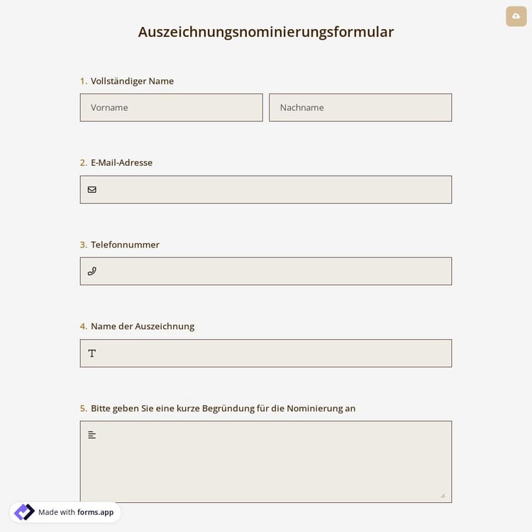Nominierungsformulare für Auszeichnungen werden verwendet, um Informationen über Einzelpersonen oder Organisationen zu sammeln, die für einen Preis in Betracht gezogen werden. Diese Formulare enthalten in der Regel Felder für den Namen des Nominierten, seine Kontaktdaten und eine kurze Beschreibung seiner Leistungen oder Qualifikationen für den Preis. Mit den Nominierungsformularen für Auszeichnungen von forms.app können Sie die Kontaktdaten der Person oder Gruppe sammeln, die die Nominierung vornimmt, in der Regel Ihre eigenen.