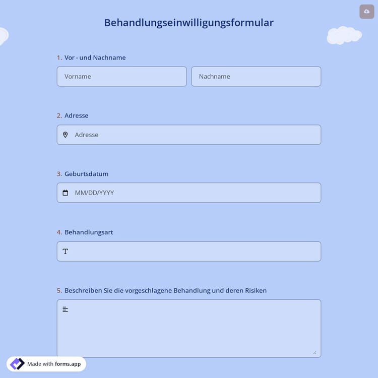 Wenn Sie Arzt sind und möchten, dass Ihre Patienten den gesamten Behandlungsprozess kennen, ist es notwendig, dieses Formular vorzubereiten. Sie können Ihr eigenes Formular ohne Code erstellen, indem Sie das Formularmuster für die Einwilligung zur Behandlung verwenden.