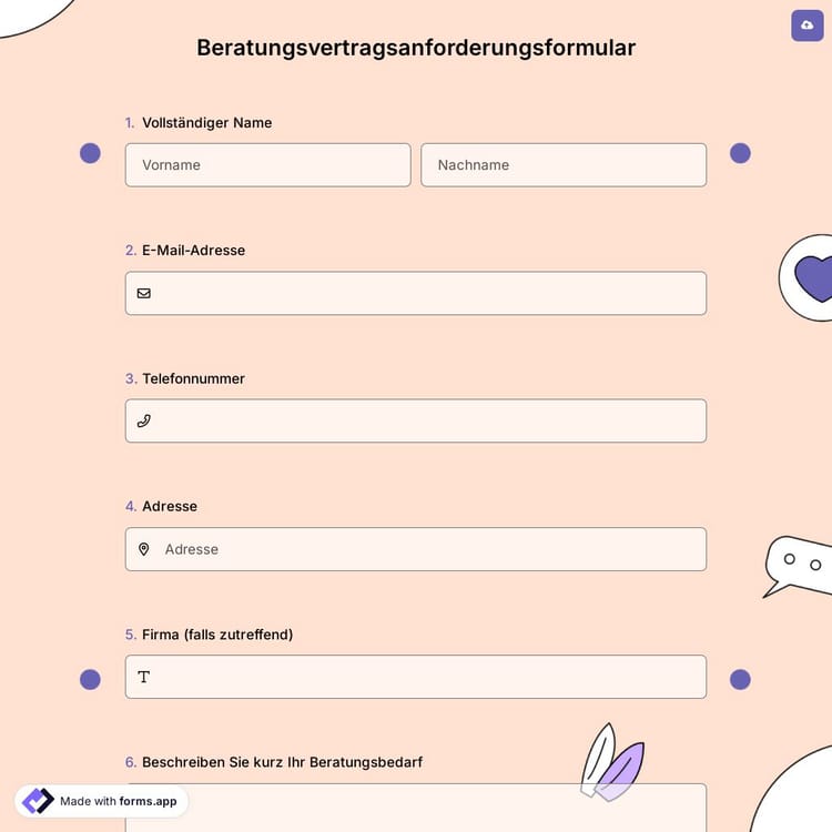 Benötigen Sie während des Beratungsprozesses eine Vereinbarung? Egal ob Sie Kunde oder Dienstleister sind, die Verwendung des Formulars für die Beantragung einer Beratungsvereinbarung wird Ihrem Unternehmen sehr nützlich sein. Beginnen Sie noch heute kostenlos Formulare mit forms.app zu erstellen!