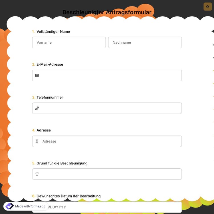 Suchen Sie ein Formular für einen beschleunigten Antrag? Sie können ganz einfach Ihr eigenes auf forms.app kostenlos erstellen. Beginnen Sie jetzt mit der Bearbeitung Ihres eigenen Formulars für beschleunigte Anträge, um Zeit bei der Datenerfassung zu sparen. Klicken Sie unten auf die Schaltfläche "Vorlage verwenden" und erhalten Sie schnell die Daten für Ihr Unternehmen.