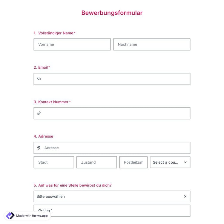 Mit dem Bewerbungsformular von forms.app wird die Suche nach dem perfekten Kandidaten für eine Stellenausschreibung in Ihrem Unternehmen erheblich erleichtert. Stellen Sie mit dieser hervorragenden Bewerbungsformular Vorlage schneller und reibungsloser ein. Völlig KOSTENLOS und erfordert keine Programmierkenntnisse. Ziehen Sie einfach per Drag & Drop, um Ihre Formularfelder anzupassen.