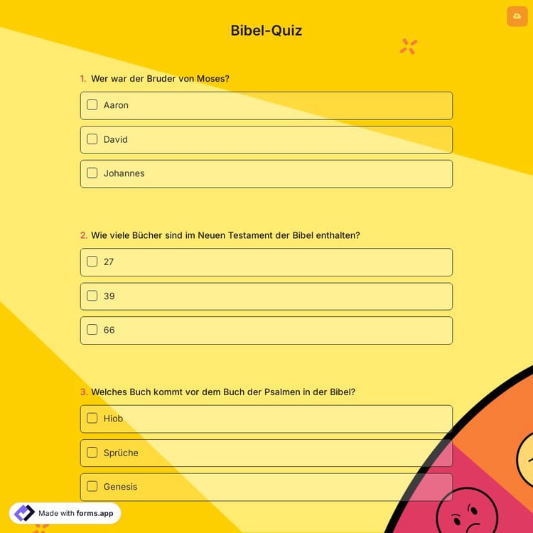 Wenn Sie nach einer lustigen Aktivität für Ihren Katechismusunterricht suchen oder einen biblischen Quizabend in Ihrer Kirche organisieren möchten, hilft Ihnen dieses Modell dabei, ein unterhaltsames und lehrreiches Quiz zu erstellen. Sie können dieses Formular verwenden, um Fragen zu verschiedenen Themen zu erstellen, wie zum Beispiel dem Alten und Neuen Testament, den Personen in der Bibel und vielem mehr.