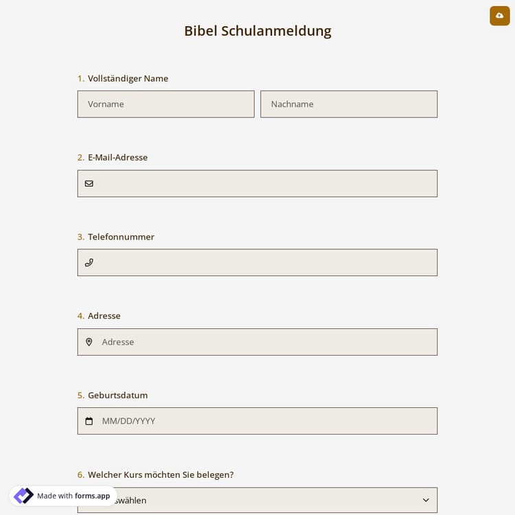 Pastoren, Schulleiter und religiöse Lehrer können ein Anmeldeformular verwenden, um wichtige Informationen über potenzielle Schüler zu sammeln, einschließlich ihrer Hintergrundinformationen, Interessen und Kontaktdaten. Mit forms.app können Sie ganz einfach ein professionelles und effizientes Anmeldeformular für die Bibelschule kostenlos erstellen!