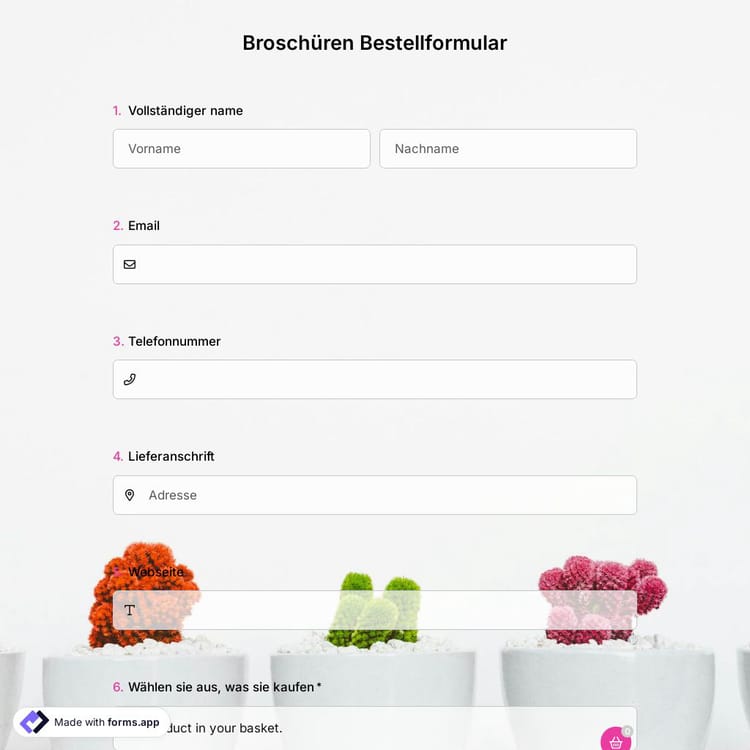 forms.app bietet Ihnen ein hochgradig anpassbares Formularbeispiel. Es enthält alle notwendigen Felder, um den Bestellvorgang für alle einfach zu machen. Sie werden ganz einfach Kontaktinformationen sammeln und die Leute über ihre Bestellungen informieren. Die Leute können auch ein Lieferdatum für ihre Bestellungen auswählen. Verwenden Sie die kostenlose Vorlage für Broschüren-Bestellformulare von forms.app, um Ihr Formular zu erstellen und Bestellungen automatisch zu sammeln!