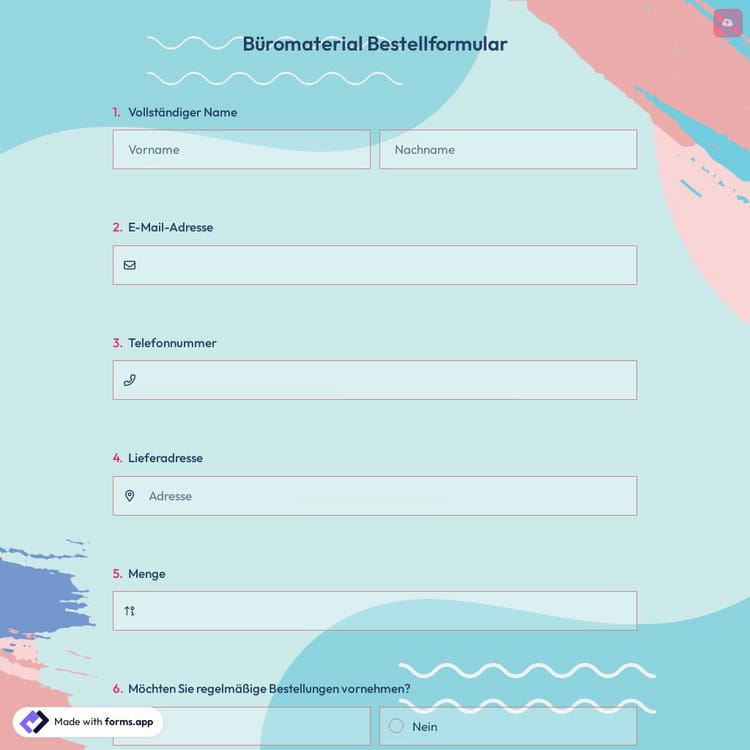 Suchen Sie ein Formular zur Bestellung von Büromaterial? Verschiedene Stile zur Auswahl! Diese Vorlagen werden den reibungslosen Ablauf Ihres Unternehmens gewährleisten, Ihnen Zeit sparen und Ihnen helfen, alles zu organisieren, indem Sie die kostenlosen Vorlagen von forms.app ausprobieren!