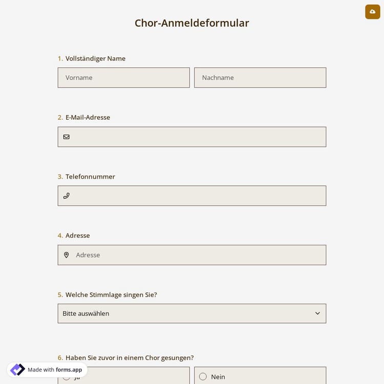 Ein Anmeldeformular für einen Chor ist ein Dokument, das von Chören verwendet wird, um wichtige Informationen über neue Mitglieder zu sammeln. Dieses Formular wird in der Regel vor dem Beitritt zu einem Chor ausgefüllt und ermöglicht es dem Chorleiter, die Stimmfach, musikalische Erfahrung und Verfügbarkeit der Person für Proben und Auftritte zu verstehen.