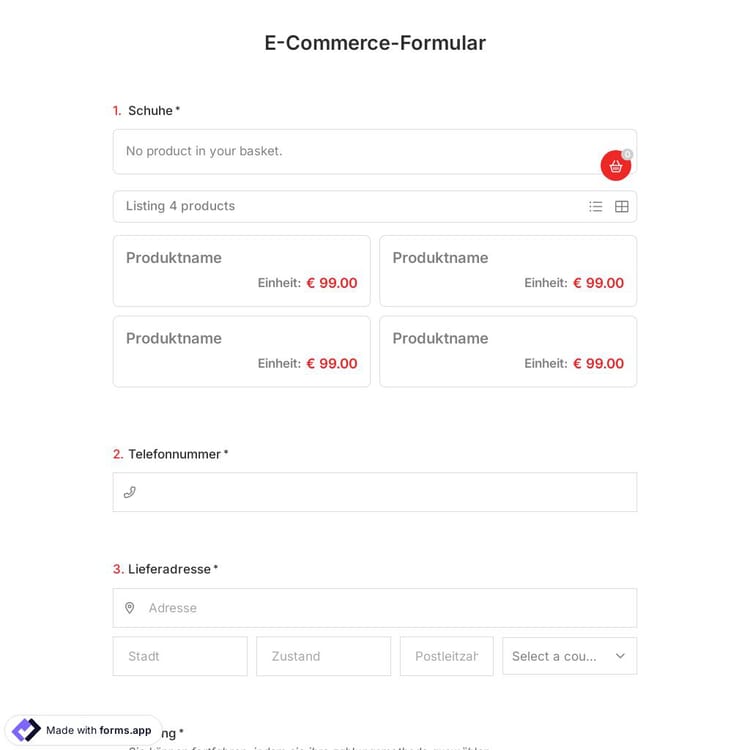 Sie möchten Ihre Produkte online verkaufen? Dann sind Sie bei uns richtig. Mit einer kostenlosen E-Commerce-Formularvorlage können Sie ganz einfach Ihre Online-Formulare erstellen und Ihre Produkte online verkaufen. Fügen Sie jetzt Ihre Produkte zu Ihrem E-Commerce-Formular hinzu und beginnen Sie, Zahlungen online zu akzeptieren!