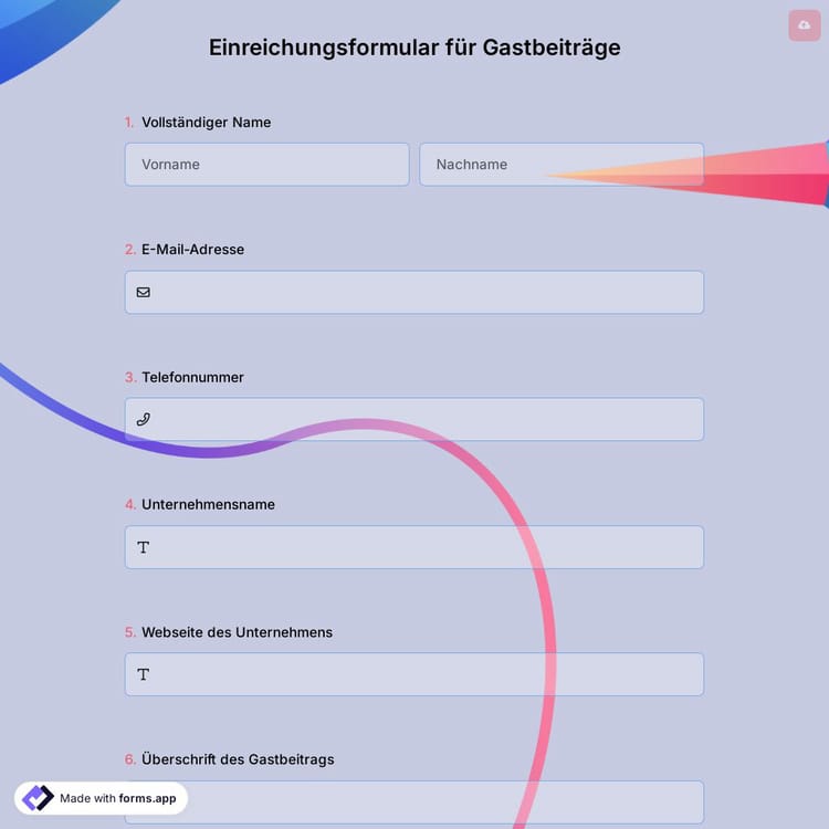 Auf „forms.app“ können Sie tolle Einreichungsformulare und Anforderungsformulare für Ihren Blog erstellen. Durch das Hinzufügen eines Datei-Upload-Felds können Sie auch Dokumenteinreichungen oder Porträtfotos von Autoren akzeptieren. Als benutzerfreundlicher Formularersteller stellt Ihnen forms.app viele Formularfelder und Formularfunktionen zur Verfügung. Nutzen Sie gerne diese kostenlose Vorlage für das Einreichungsformular für Gastbeiträge und erstellen Sie Ihr eigenes Dokument für die Annahme von Gastbeiträgen!