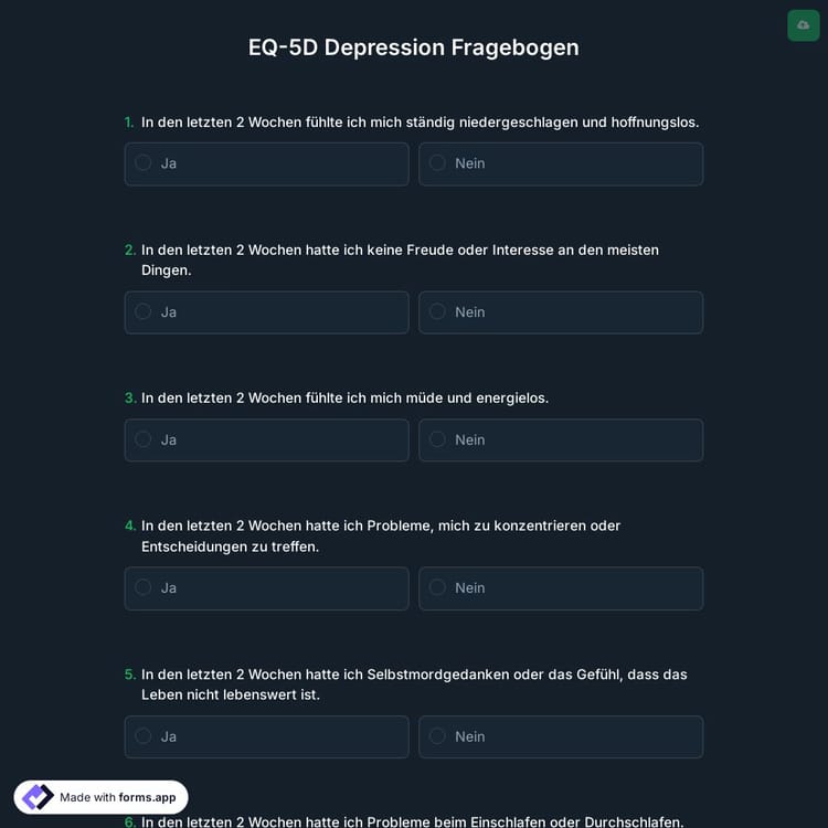 Der EQ-5D Depression Fragebogen ist eine Möglichkeit, die gesundheitsbezogene Lebensqualität zu messen. Der Fragebogen bewertet fünf Aspekte der Lebensqualität: Mobilität, Selbstpflege, übliche Aktivitäten, Schmerz oder Unbehagen und Angst oder Depression. Jede Dimension wird auf einer Skala von 1 bis 3 bewertet. 1 steht für das Fehlen von Problemen, 2 für einige Probleme und 3 für schwere Probleme.