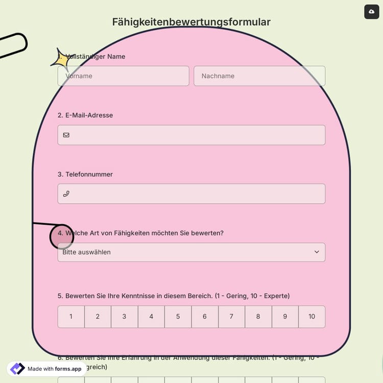Ein Kompetenzbewertungsformular beinhaltet in der Regel Fragen zur Bewertung von Fähigkeiten von Mitarbeitern. Mit diesem Formular können Sie allgemeine Fähigkeitsfragen stellen und die Teilnehmer anhand ihrer Antworten bewerten. In nur wenigen Sekunden können Sie dieses vollständig kostenlose Kompetenzbewertungsformular nutzen.