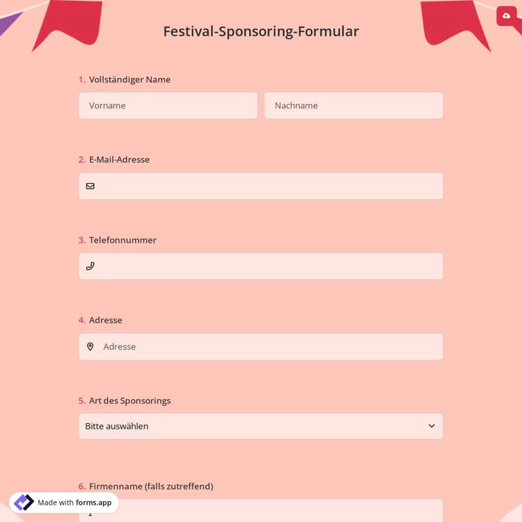 Wenn Sie an einer Sponsoring für ein Festival interessiert sind, ist dieses Sponsoring-Formular für Festivals genau das Richtige für Sie. Ein Sponsoring-Formular für Festivals ist eine Möglichkeit, einen Deal zwischen einem Sponsor und einem Festival-Veranstalter abzuschließen. Mit forms.app können Sie ganz einfach Ihr Sponsoring-Formular erstellen. Verwenden Sie diese vorgefertigte Vorlage oder erstellen Sie Ihr eigenes Formular von Grund auf neu.