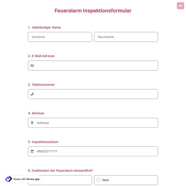Ein Formular zur Inspektion von Brandmeldern ist eine Art Online-Formular, das die Arbeit von Inspektoren beim Überprüfen von Alarmen erleichtert. Diese Inspektionsformulare enthalten verschiedene notwendige Felder, sodass keine zusätzlichen Fragen hinzugefügt werden müssen. Falls gewünscht, bietet forms.app jedoch auch erweiterte Anpassungsmöglichkeiten.