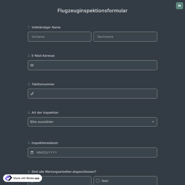 Flugzeuge sind komplexe Maschinen, die regelmäßig und korrekt überprüft werden müssen, um Fehlfunktionen zu vermeiden. Eine regelmäßige und detaillierte Inspektion mit einem Formular hilft, kritische Fehler zu vermeiden. Beginnen Sie jetzt mit dem kostenlosen Modell auf forms.app!
