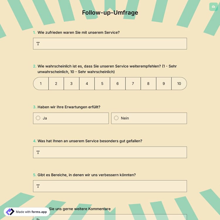 Einige Unternehmen und Organisationen glauben, dass sie zu dem Schluss gekommen sind, nachdem sie ihre Teilnehmer einmal befragt oder ihnen eine E-Mail geschickt haben. Andere möchten wissen, ob sich die Einstellung des Teilnehmers im Laufe der Zeit geändert hat oder nicht; Hier kommen Folgebefragungen ins Spiel. Beginnen Sie mit der Erstellung einer Folgeumfrage mit der Vorlage, die Ihnen forms.app bietet!