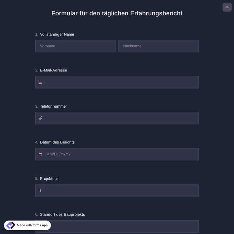 Benötigen Sie ein Formular für tägliche Feldberichte für Ihr Unternehmen? forms.app ist ein Online-Tool zur Erstellung von Formularen, mit dem Sie ein Formular für Berichte gemäß den Anforderungen Ihres Unternehmens erstellen können. Es ist wichtig, dass Ihr Team täglich seine Beobachtungen festhält, um den Fortschritt zu verfolgen. Öffnen Sie dieses Formular für tägliche Feldberichte und legen Sie sofort los!