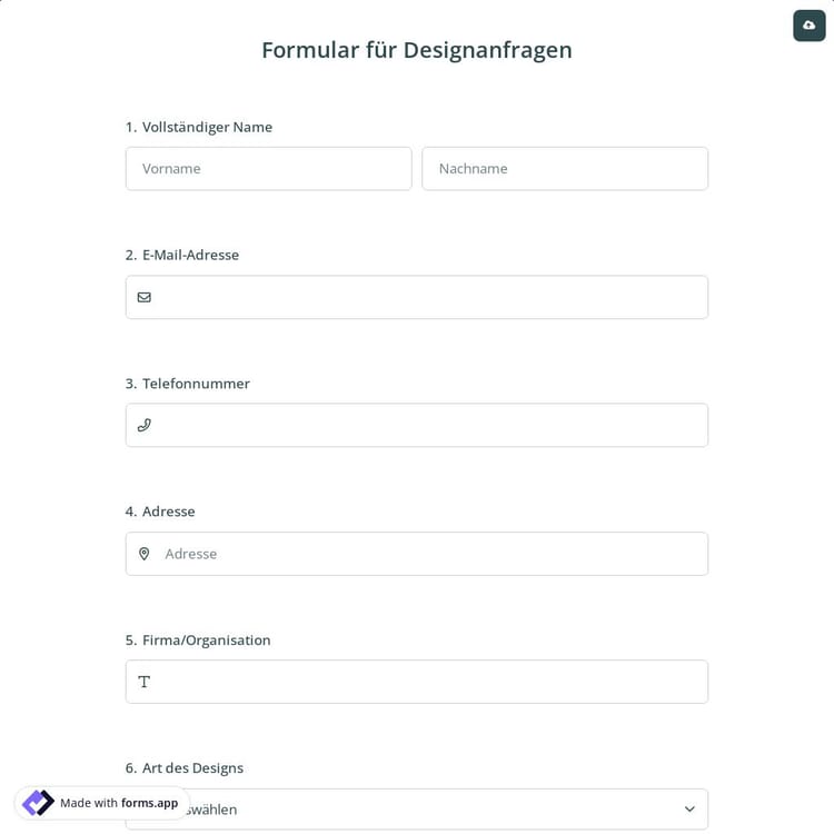 Suchen Sie nach einem Design für Ihre Marke oder den persönlichen Gebrauch von kreativen Designern? Verwenden Sie unser Online-Designanfrageformular, um in nur wenigen Minuten Ihr eigenes Formular zu erstellen. Sie benötigen keine Programmierkenntnisse, um Ihr Formular zu erstellen! Erstellt von forms.app Team