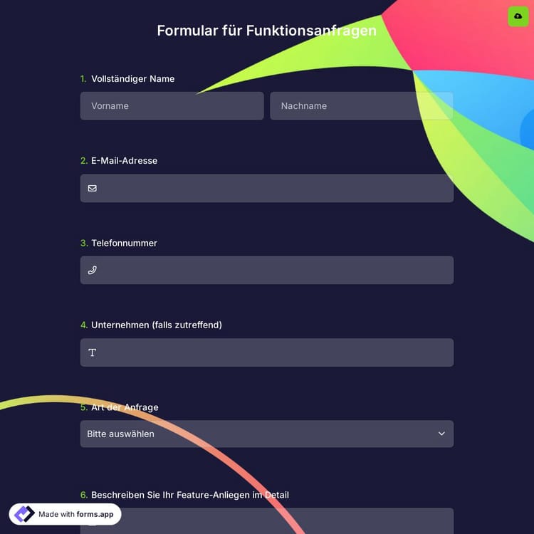 forms.app ermöglicht es Ihnen, ganz einfach eine Formularvorlage für Funktionsanfragen ohne Programmierkenntnisse zu erstellen. Diese Vorlage für Formulare für Anfragen enthält essentielle Felder und ein professionelles Design, um Ihren Anforderungen gerecht zu werden. Befolgen Sie die folgenden Schritte, um Ihr eigenes Formular für Funktionsanfragen zu erstellen: