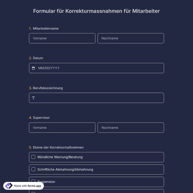 ● Mit dem Mitarbeiter-Korrekturmaßnahmenformular von forms.app können Sie Sanktionen für Fehlverhalten als schriftliche und mündliche Verwarnung oder Verweise und Disziplinarmaßnahmen kategorisieren.