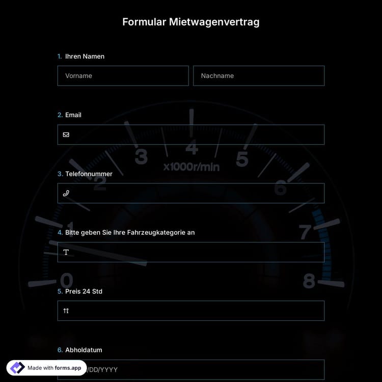 Mit einem Online-Formular können Sie eine Reihe von Dingen überprüfen und sicherstellen, dass die Kunden Ihre Bedingungen verstehen und ihnen zustimmen. Es ist auch möglich, der Vereinbarung einige Fragen hinzuzufügen. Auf diese Weise haben Sie alle notwendigen Informationen, die Sie für eine Autovermietung benötigen.Mietvertragsformular die Menschen über verschiedene Themen, wie