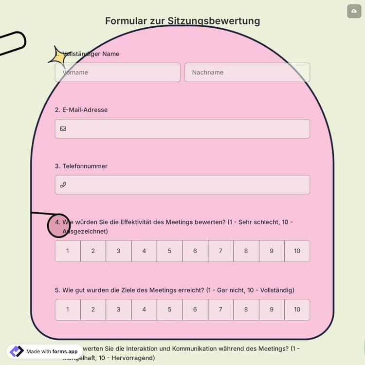 Meeting-Bewertungsformulare sind eine hervorragende Möglichkeit, wertvolles Feedback zu sammeln und Verbesserungsbereiche zu identifizieren. Egal, ob Sie Kundenzufriedenheit, Fortschritt von Schülern, Mitarbeiterleistung oder Kundenfeedback sammeln möchten, unsere kostenlosen Online-Bewertungsformulare erleichtern die Sammlung und Verfolgung von Feedback.