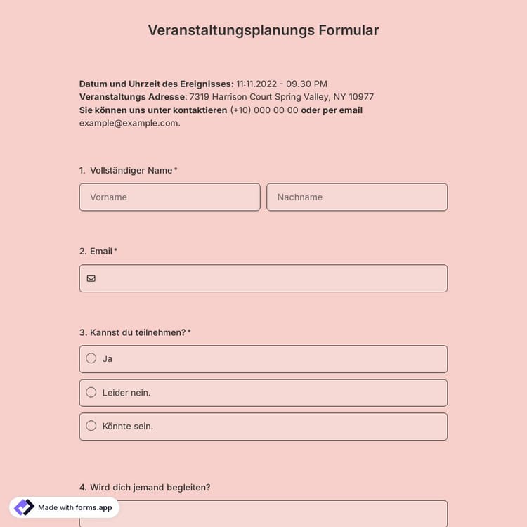 Ob Sie eine private Veranstaltung oder eine öffentliche Veranstaltung organisieren, Ihre Formulargestaltung entscheidet über die Entscheidungen der Menschen. Sie müssen also sicherstellen, dass Ihr Formular sowohl professionell als auch ansprechend aussieht. Dadurch wird eine hohe Formulareinreichungs- und Anwesenheitsrate gewährleistet . Und forms.app verfügt über alle notwendigen Funktionen, um in Sekundenschnelle fantastisch aussehende Formulare zu erstellen. Tatsächlich verfügt diese Formularvorlage für die Veranstaltungsplanung über ein auffälliges Design.