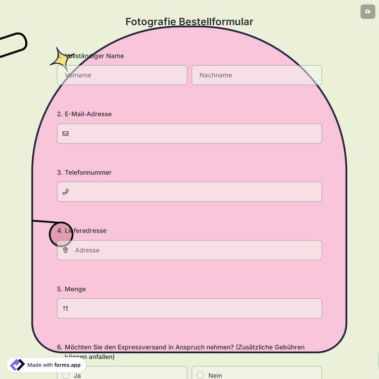 Wenn Sie in der Fotografie tätig sind und Anfragen von Kunden für Veranstaltungen wie Hochzeiten, Organisationen oder Sonderbestellungen von Fotos erhalten, können Sie mit einem Online-Formular sofort Fotosessions und Bestellungen von Kunden sammeln. Erstellen Sie noch heute Ihr Formular mit einem kostenlosen Formularvorlage für Fotobestellungen und verwalten Sie die Bestellungen Ihrer Kunden schneller!