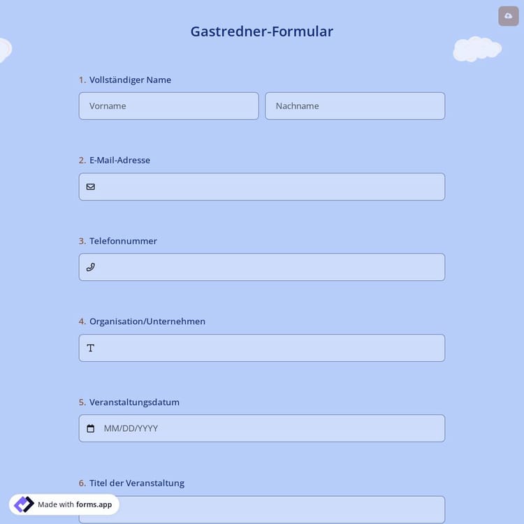 Wenn Sie eine Einrichtung sind, die Gastredner akzeptiert, wird dieses Gastredner-Formular Ihre Arbeit erleichtern. Sie können im Voraus Informationen über die Gastredner und das Thema, das sie behandeln möchten, erhalten. Sie können Ihr eigenes Formular kostenlos mit forms.app erstellen.