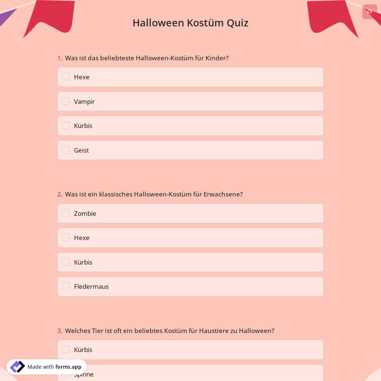 Die Verwendung des Halloween-Kostüm-Quiz ist eine unterhaltsame und einfache Möglichkeit, um Ihre Freunde, Familie und Kollegen in die Aufregung der Wahl ihres Halloween-Kostüms einzubeziehen. Außerdem ist es eine großartige Gelegenheit, um alle in die Aufregung der Organisation Ihrer Halloween-Party einzubeziehen. Verwenden Sie dieses kostenlose Halloween-Kostüm-Quiz-Formular!
