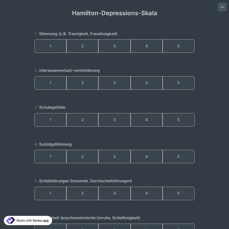 Die Hamilton-Depressions-Skala ist ein standardisiertes Fragebogen, der von Fachleuten im Bereich der psychischen Gesundheit verwendet wird. Mit diesem Skala können Fachleute die Symptome und Schwere der Depression bei Einzelpersonen messen. Es kann während und nach der Behandlung verwendet werden, um deren Wirksamkeit zu überwachen. Verwenden Sie dieses Hamilton-Depressions-Skala-Formular, um Ihre Umfrage noch heute zu erstellen!
