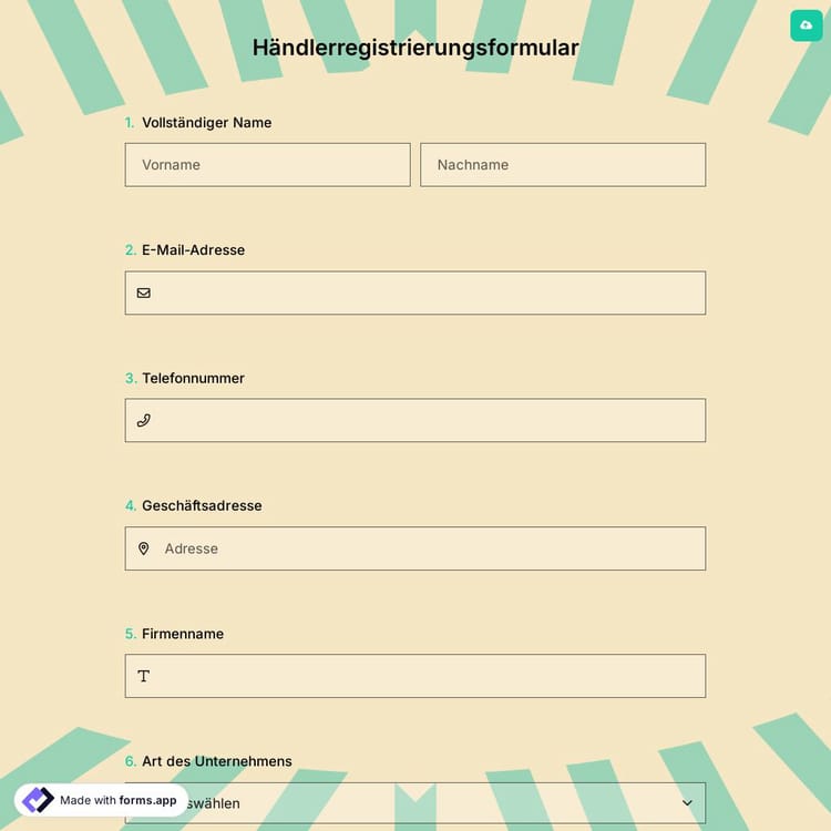 Ein Händler-Registrierungsformular ist ein Dokument, das von Unternehmen oder Organisationen verwendet wird, um Händler oder Vertriebsmitarbeiter zu registrieren, die ihre Produkte oder Dienstleistungen vertreten. Machen Sie sich keine Sorgen; unsere Website bietet kostenlose und benutzerfreundliche Registrierungsformulare.