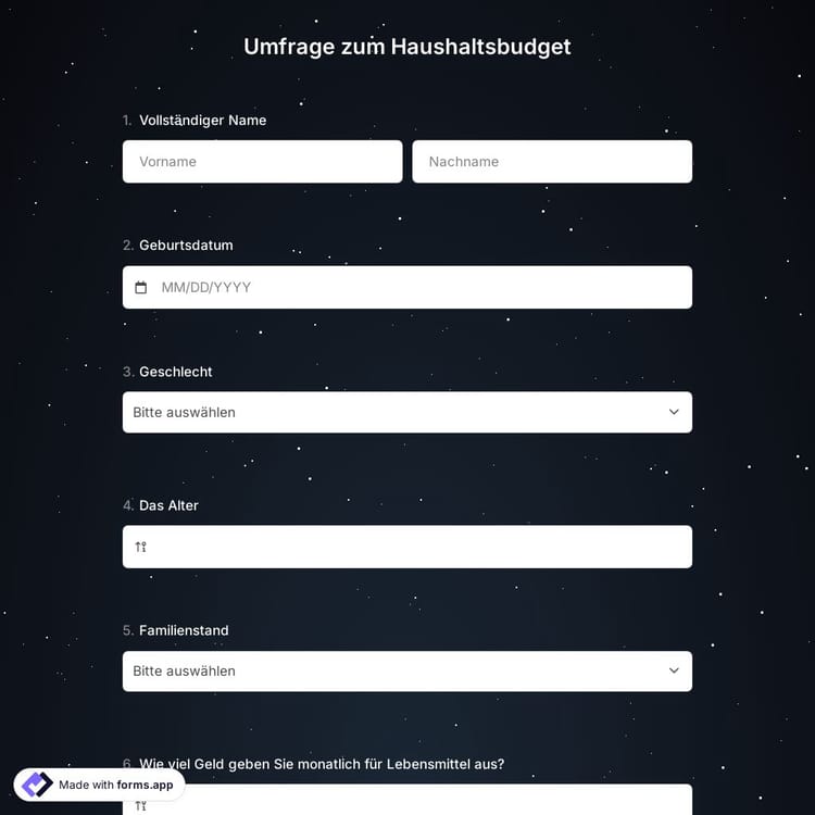 Wenn Sie Ihr monatliches Budget erstellen, ist es am sinnvollsten, die Haushaltsbudget-Formularvorlage von forms.app zu verwenden, um Einnahmen und Ausgaben auszugleichen. Machen Sie das Beste aus Ihrem Haushaltsplan mit dieser Haushaltsvorlage für Familien und machen Sie sich keine Sorgen um den Rest.