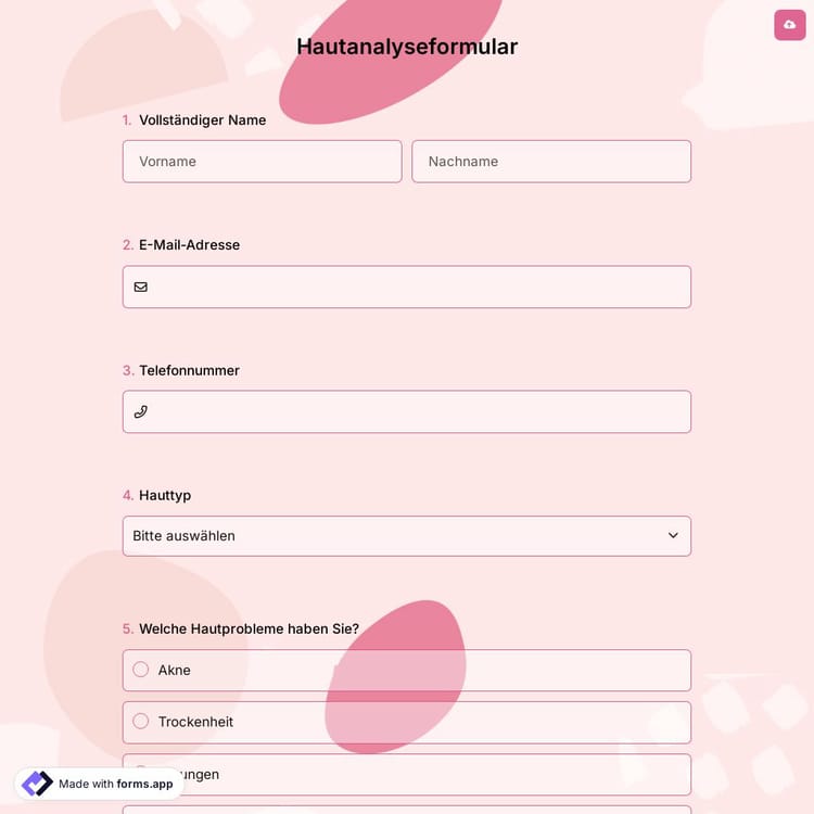 Das Hautanalyseformular ist dazu gedacht, Hautkrankheiten und -probleme zu erkennen. Es stellt Fragen zur Haut und sammelt Informationen über Probleme und die Hautstruktur der Teilnehmer. Basierend auf diesem Formular können Hautprobleme erkannt und eine angemessene Behandlung durchgeführt werden. Gleichzeitig ist das Hautanalyseformular im Bereich der Kosmetik wichtig. Sie können dieses Bewertungsformular kostenlos auf forms.app nutzen.