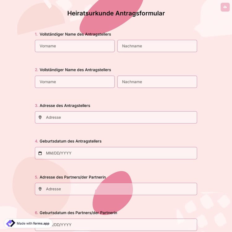 Klicke auf den "Vorlage verwenden"-Button und beginne dein Heiratsurkunden-Bestellformular anzupassen. Dadurch kannst du den Prozess des Heiratsurkunden-Bestellens vereinfachen und das Formular effizient ausfüllen. Du kannst es nach deinen Wünschen anpassen und Felder wie ein Unterschriftenfeld hinzufügen, ohne Programmierkenntnisse zu benötigen. Verschwende keine Zeit mit unnötigem Papierkram; erledige deine Aufgabe mit dem kostenlosen Online-Formularersteller forms.app und erstelle jetzt dein Heiratsurkunden-Bestellformular!