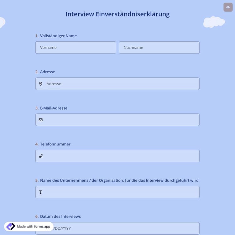 Möchten Sie ein Formular für die Einwilligung zu Interviews entsprechend Ihren Bedürfnissen erstellen? Sie können das kostenlose Online-Tool forms.app verwenden, um ein Formular für die Einwilligung zu Interviews zu erstellen. Klicken Sie auf die Schaltfläche "Vorlage verwenden" unten, um mit der Erstellung Ihres Formulars zu beginnen!