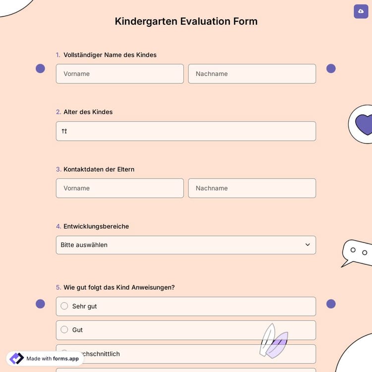 Möchten Sie mehr über Online-Kindergartenkinder erfahren? Mit dem Kindergartenbewertungsformular lernen Sie schnell, was Kinder brauchen. Wenn Sie Formulare ohne Codierungskenntnisse erstellen möchten, verwenden Sie forms.app in kürzester Zeit!