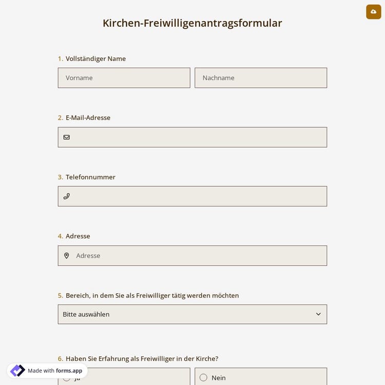 Erstellen Sie Ihre eigene Online-Formularvorlage für die Beantragung von Freiwilligenarbeit in der Kirche mit der kostenlosen forms.app-Vorlage. Nachdem Sie sie für Ihre Kirche angepasst haben, können Sie sie in Ihre Website integrieren oder direkt teilen. Beginnen Sie mit der Erstellung von Formularen und ermöglichen Sie es Freiwilligen, einfach auszufüllen.