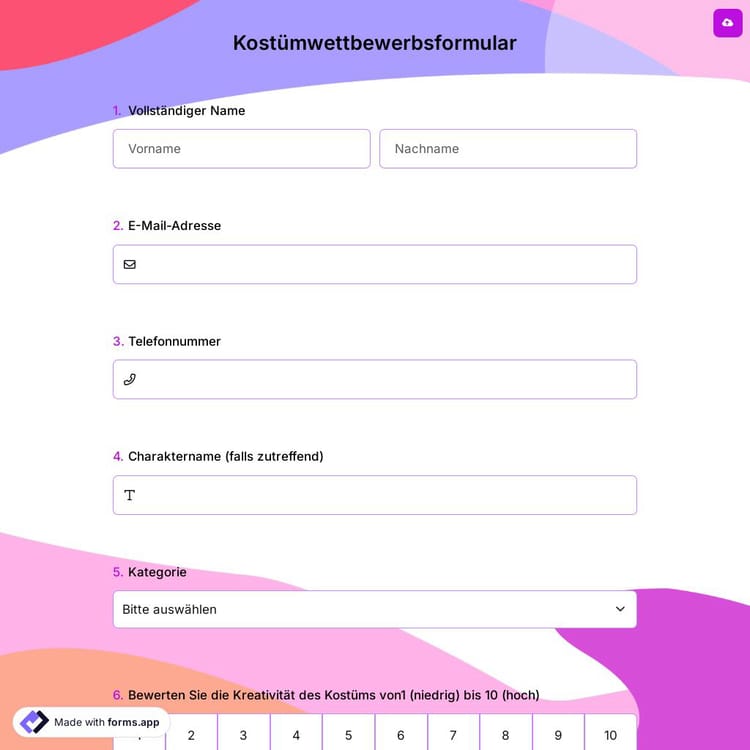 Wenn Sie einen Kostümwettbewerb bewerten oder eine Großveranstaltung organisieren, verwenden Sie ein Online-Formular, um Kostüme zu bewerten oder zu bewerten. Passen Sie das Online-Formular nach Ihren Wünschen an und beginnen Sie noch heute damit!