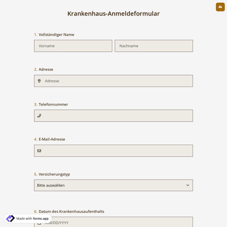 Verwenden Sie ein Online-Formular, um die Informationen der Patienten einfach zu sammeln und Krankenhausakten für Erstbesucher zu erstellen. Erstellen Sie Ihr Formular mit dem kostenlosen Krankenhaus-Anmeldeformular-Modell von forms.app. Beginnen Sie noch heute mit der Verwendung des Formulars für weniger Papier und mehr Produktivität!