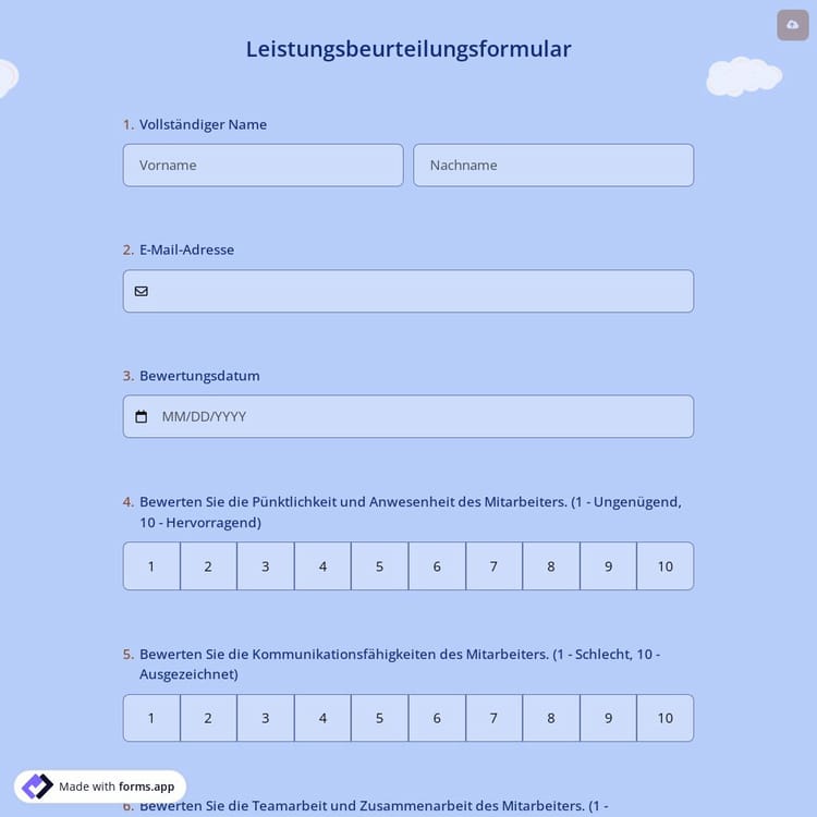 Ein Online-Leistungsbeurteilungsformular ist eine Umfrage zur Bewertung der Arbeitsleistung einer Person. Es umfasst in der Regel eine Reihe von Fragen, um Informationen über die Arbeit eines Mitarbeiters, seine Stärken und Verbesserungsbereiche zu sammeln.