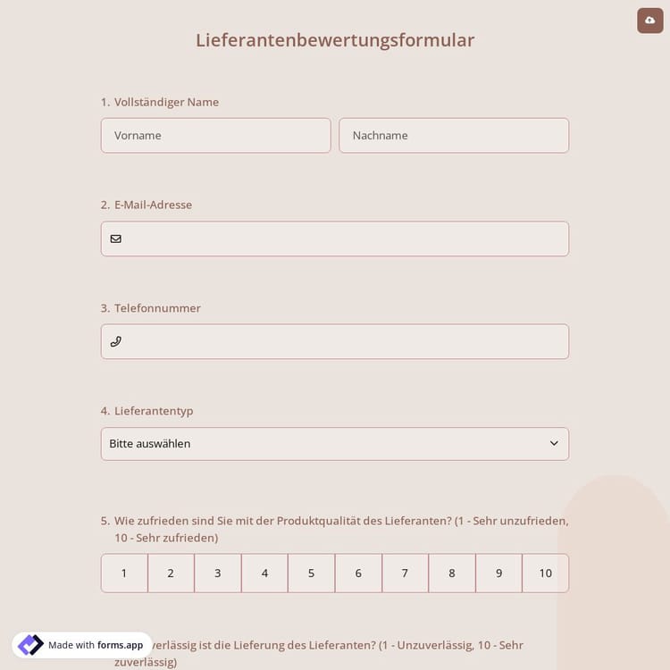 Professionelle Unternehmen, die derzeit mit Lieferanten zusammenarbeiten oder dies in Betracht ziehen, können Lieferantenbewertungsformulare verwenden, um die Gesamtleistung der Lieferanten zu messen. Anstatt eine einfache Tabelle zu verwenden, können Sie mit dem Lieferantenbewertungsformular von forms.app wie diesem beginnen und von seinen praktischen Funktionen profitieren. Wenn Sie sich fragen, wie Sie eines erstellen können, befolgen Sie einfach die folgenden Schritte: