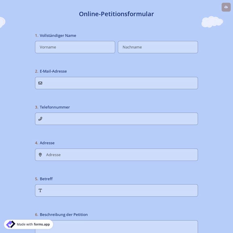 Verwenden Sie diese Online-Petitionsformularvorlage, um elektronische Unterschriften für Ihre Petition zu sammeln und Ihr Anliegen voranzutreiben. Sie können diese mobilfreundliche Online-Petitionsvorlage auf Ihrer Website verwenden, sie in sozialen Medien teilen und all dies ohne Programmieraufwand tun. Passen Sie diese Vorlage schnell und einfach an oder erstellen Sie Ihre eigene und beginnen Sie mit dem Sammeln von Unterschriften mit forms.app!