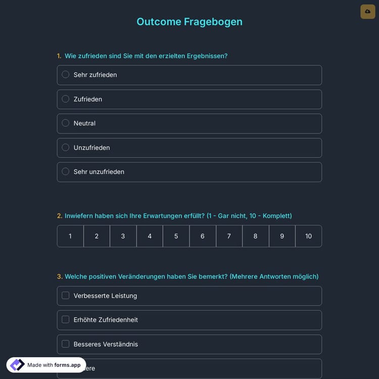 Ein Ergebnisfragebogen ist eine Umfrage, die verwendet wird, um Informationen über alle durchgeführten Studien und/oder Maßnahmen zu erhalten, mit dem allgemeinen Ziel, die Wirksamkeit dieser Maßnahmen durch ihre Ergebnisse zu messen.